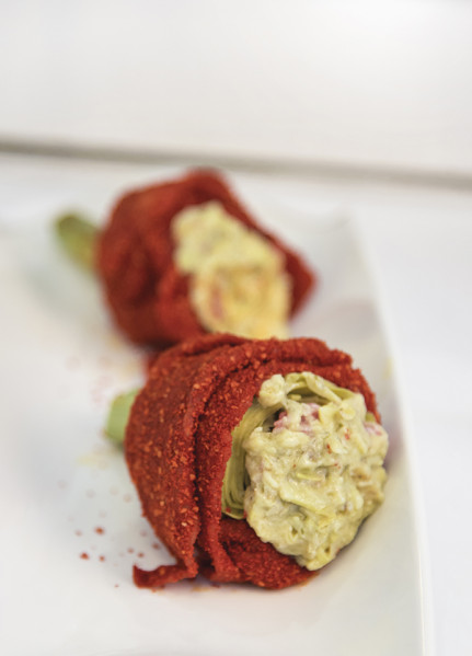 Scolare completamente i Carciofi alla Giudìa dal loro olio. Arrotolare la carne nel Panrosso e avvolgerla ai petali esterni dei Carciofi in maniera irregolare. Aprire delicatamente i cuori dei carciofi e riempirli con la carne macinata unita alla Gransalsa di cuori di carciofi.