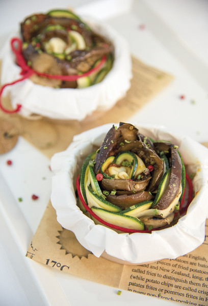Tagliare la pasta sfoglia a strisce di circa 7 cm. Tagliare le zucchine fresche a fettine sottili. Scolare le Melanzane dall’olio e tagliare a metà le fette. Distribuire le zucchine e le melanzane in modo che sporgano verso l’esterno di circa 1 cm. Aggiungere la Salsa di pomodori secchi. Piegare l’impasto in orizzontale, mantenendo l’uscita di 1 cm delle melanzane e delle zucchine rispetto alla pasta. Arrotolare e legare delicatamente con un cordoncino il fiore che ne risulta. Distribuire sul fiore qualche grano di Pepe Rosa ed Erba cipollina. Infornare a 190°C per 10-12 minuti, rigirando sopra e sotto.