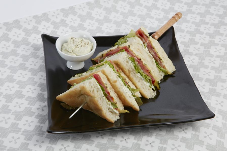 Cut the focaccia in halves. Spread the cheese and hemp pesto on one side, zucchini and speck on the other. Toast in the oven for 4/5 minutes at 200˚C. Finish with salad, tomatoes, salt and pepper. Cut into triangles and join them with a wooden skewer.
