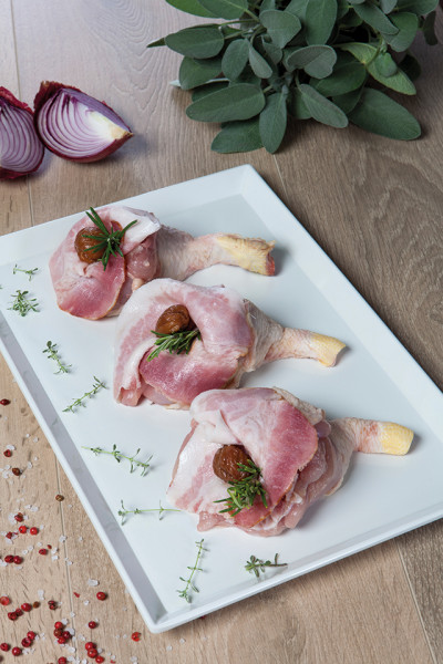 Disossare i fuselli di pollo. Tritare la Castagnapronta e l'aglio ed impastare con il macinato di pollo, il Fiokki di patate ed il Parmigiano grattugiato. Lasciare riposare 10 minuti. Farcire i fuselli e guarnirli con una fetta di Guanciale ed una Castagna intera. Decorare con erbe aromatiche fresche.