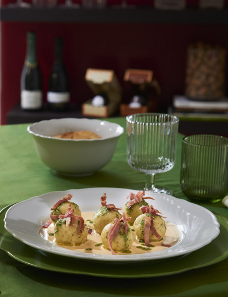 Preparare l’impasto degli Gnokki Menù seguendo le istruzioni riportate sulla confezione, avendo cura di aggiungere all’acqua il Pesto di Aglio Orsino. Una volta impastati gli Gnokki, formare delle palline da circa 30 g l’una. Lessare le palline preparate in acqua bollente salata e scolarle appena vengono a galla. A parte scaldare la Grancrema di Taleggio con il latte e stendere a specchio sul piatto il composto ottenuto. Aggiungere qualche goccia di Pesto di Aglio Orsino e ultimare con lo speck tagliato a listarelle, saltato in padella precedentemente.
