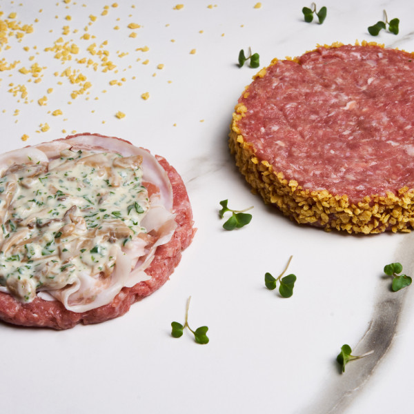 Dividere il macinato in due parti uguali. In una parte formare con l’apposito stampo circolare il classico hamburger. Farcirlo con la pancetta coppata, i Funghi prataioli trifolati in asettico mescolati alla Grancrema di Formaggio di Fossa e prezzemolo tritato. Con il restante macinato formare un altro hamburger dello stesso diametro e sovrapporlo a quello appena farcito. Chiudere bene i bordi dell’hamburger farcito. Ultimare impanando con il Pangiallo il bordo dell’hamburger.