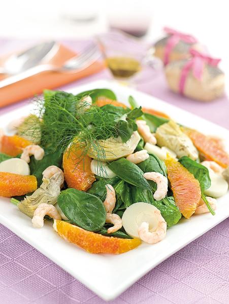 Pulire l'insalata, lavarla ed asciugarla utilizzando la verdura come base. Aggiungere lo spinacino e arricchire l'insalata con i gamberetti reidratati, i cuori di palma tagliati a rondelle, le fettine di arancio tagliate a vivo, i carciofi spaccatelli e condire con una vinaigrette preparata con olio extra vergine d'oliva, sale e pepe e aceto balsamico Riserva. Servire decorando con un ciuffetto di finocchietto selvatico.