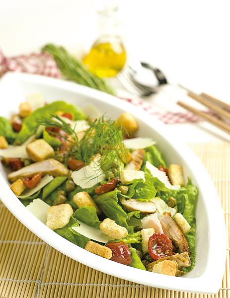 Pulire l'insalata, lavarla ed asciugarla ed utilizzarla come insalata di base, Nel frattempo spalmare il petto di pollo con la crema di rosmarino e rosolarlo in portandolo a cottura. Salarlo leggermente e tagliarlo a julienne. Integrare il petto di pollo all'insalata ed aggiungere i crostini di pane tostato, i pomodori dorati, le scaglie di parmigiano ed i capperini in olio extra vergine d'oliva. Preparare una citronette con olio, sale, pepe e aceto balsamico Riserva. Condire l'insalata e decorare con un ciuffetto di finocchietto selvatico fresco
