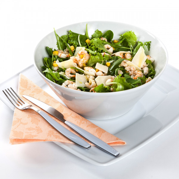 Disporre tutte le verdure in una ciotola. Aggiungere i gambereti re idratati e il mais. Condire con olio e aceto balsamico. Aggiustare di sale e guarnire con scaglie di grana.
