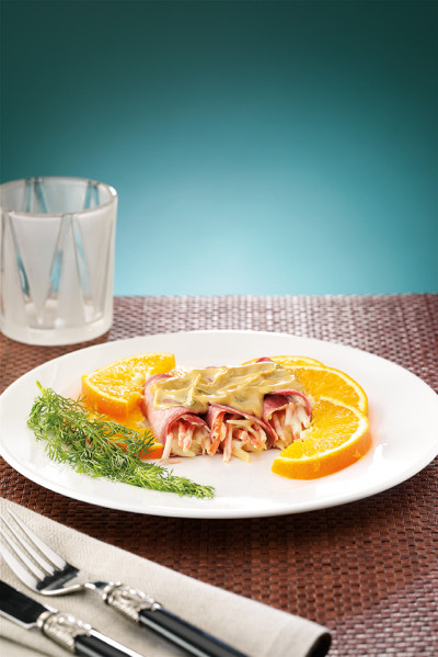 Scolare l’insalatina arcobaleno dal proprio liquido di governo e trasferirla in una ciotola, amalgamandola con 250 g. di maionese. A questo punto pelare la lingua e tagliarla a fette. Farcire ciascuna fetta di carne con l’insalata capricciosa, quindi arrotolarla e confezionare gli involtini. Nel frattempo mescolare alla maionese rimasta, l’aceto balsamico, la paprica e l’aneto fresco tritato. Accomodare gli involtini di lingua su di un piatto da portata e ricoprirli con la salsa preparata. Decorare con fettine d’arancia e servire.