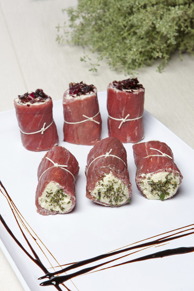 Confezionare le due farcìe. Dividere la ricotta, riporla in 2 bowl ed insaporirla una con radicchio e parmigiano, l'altra con crema di rosmarino e parmigiano. Confezionare gli involtini e legare con dello spago per arrosti. Decorare a piacere. Con gli ingredienti indicati si ottengono sei involtini per tipo.