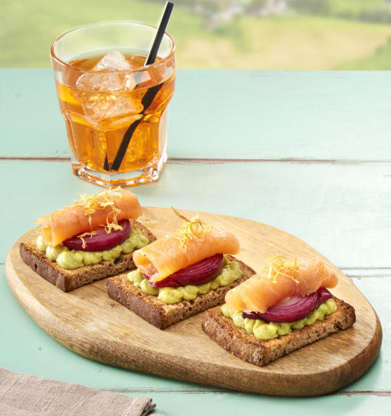 Slice the red onion to a thickness of about 6-7mm and toss in the pan for 2-3 minutes with extra virgin olive oil, vinegar, salt and sugar. Now cut 3 slices of multigrain bread and toast them in the pan with a drizzle of extra virgin olive oil. Once golden, arrange them on a chopping board and add the Guacamole sauce, sweet and sour red onion, and smoked salmon. Decorate with a few marigold petals and a drizzle of oil.