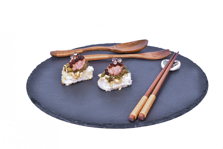Stemperare a bagnomaria la Grancrema di scamorza affumicata, quindi inserirla in una sac à poche. Ricoprire i nigiri di riso con la Grancrema di scamorza affumicata a filo, quindi aggiungere la crema di friarielli e ultimare con la battuta di carne. Decorare con perline di Aceto Balsamico