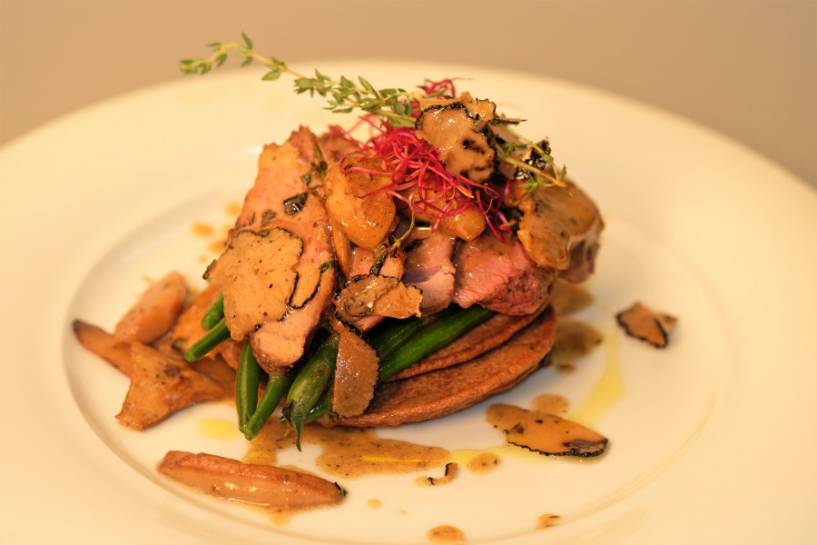 To start, prepare the butter for the pancakes, in a bowl sift the chestnut flour, the self-rising flour and the cocoa powder, add a pinch of salt and incorporate the coconut milk and egg. Mix using a whisk and leave it to rest for at least 30 minutes. In a pan with a tablespoon of extra virgin olive oil, brown the duck breast seasoned with salt, and pepper, the porcini mushrooms and a sprig of thyme, deglaze with the prosecco and continue to cook until the desired temperature is reached. Let the meat rest for 15 minutes. Cook the pancakes in a pan with the butter. Place the pancakes in the center of the plate then top them with the green beans , the sliced duck breast and the sauce made with the porcini mushrooms. Finish with the truffle carpaccio, the sprouts and a sprig of thyme.