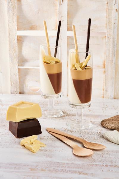 Portare a bollore il latte con la panna. Aggiungere la panna cotta con una frusta, riportare a bollore e lasciare sul fuoco per 1 minuto. Versare metà della panna cotta nei bicchieri in posizione obliqua e lasciare rapprendere in abbattitore. Dividere la restante panna cotta in 2 parti uguali, ad una aggiungere la glassa al cioccolato e all’altra il caffè espresso. Quando la panna cotta versata nel bicchiere si sarà solidificata, versare quella al cioccolato, rimettere in abbattitore e ripetere con quella al caffè. Se durante queste fasi la panna cotta ancora da versare si solidifica metterla qualche secondo nel microonde o sul fuoco per pochi minuti. Servire decorando con scaglie di cioccolato fondente e bianco.