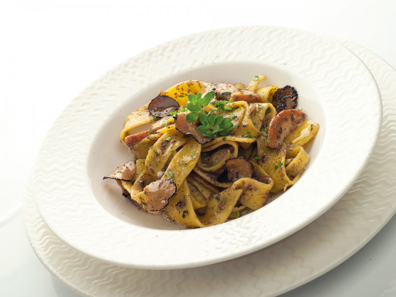 In a pan with a drizzle of oil sautè the garlic, after a minute add the drained porcini mushrooms and sauté for few minutes with some chopped parsley. Cook the fresh pappardelle in boiling salted water until al dente. Incorporate the truffle sauce with a little of the cooking water.Drain the pasta and toss in the mushroom sauce. Garnish with few slices of truffle carpaccio.