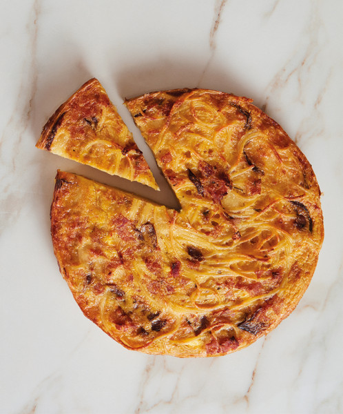 Beat the eggs in a bowl with salt, pepper, parsley and the grated Parmigiano Reggiano cheese. Boil the spaghetti al dente, season with extra‑virgin olive oil and, when cooled down, pour into the previously seasoned egg. Heat a 28‑30 cm diameter frying pan with two tablespoons of extra‑virgin olive oil and, when hot, pour in half of the seasoned spaghetti, arrange the Bruschetta Mia cheese, the slices of ham and the Porcini Mushrooms drained from the oil. Cover with the remaining spaghetti. Cook over a low heat, covering with a lid. Check after ten minutes: as soon as a crust has formed at the bottom the pasta omelette is ready to be turned over. Continue cooking over a low heat and without the lid so that the omelette becomes crispy. Once cooked, transfer to a serving dish. The pasta omelette is delicious both hot and cold.
