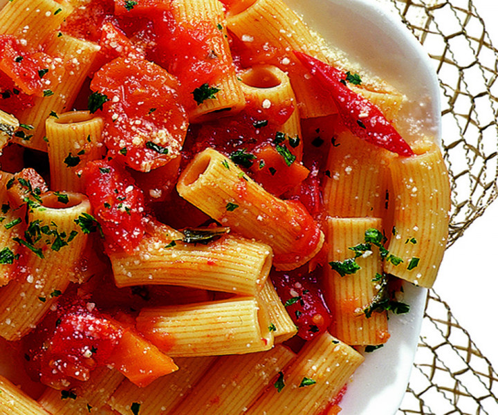 Cook the rigatoni in boiling salted water, keeping them al dente. Meanwhile, in a pan heat up the Pomodorina Sauce adding some chopped basil leaves, for a touch of freshness. Toss the rigatoni with the sauce with a sprinkle of chopped parsley.