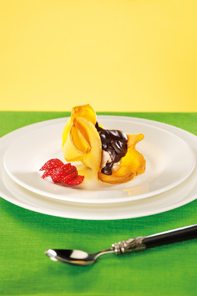 Semifreddo di amaretto in cialda con salsa al cioccolato