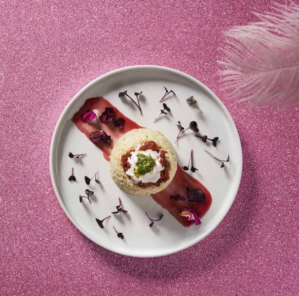 la cipolla tritata insieme a un po’ d’Olio extra vergine; versare il Riso e tostarlo per qualche minuto, quindi sfumare con il vino bianco e lasciar evaporare. A questo punto continuare la cottura incorporando poco alla volta il brodo preparato. A cinque minuti dal termine della cottura, spegnere e aggiungere il Pesto di Aglio Orsino. Stendere il riso su un piano di marmo facendolo raffreddare. Una volta tiepido, inserirlo nei pirottini precedentemente imburrati e farlo raffreddare. Al momento del servizio scaldarlo in forno a 170C° con 50% di umidità per 15 minuti. Sul piatto stendere una pennellata di Rape rosse frullate e posizionare al centro lo sformato. Aggiungere Èragùdipolpo scaldato, la burrata e il Pesto di Aglio Orsino. Ultimare decorando con germogli e Petali di rosa.