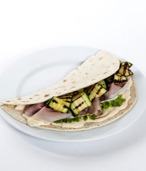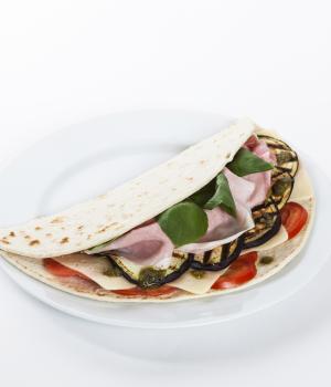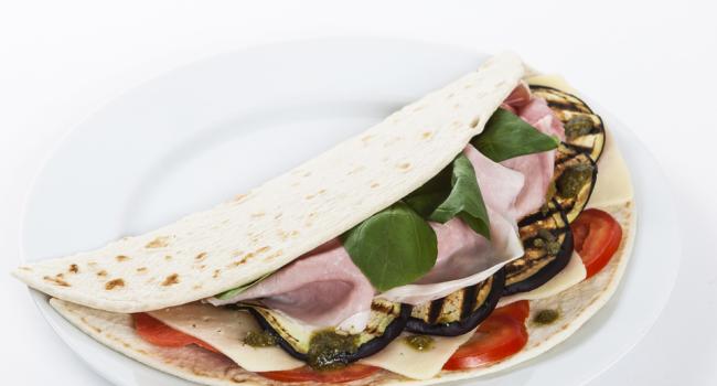 Piadina with aubergines, ham and Genovese Pesto