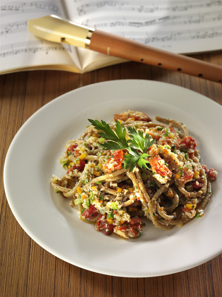 Spaghetti alla chitarra con olive taggiasche, polpa di granchio e verdurine