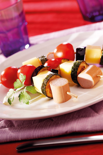 Lavare le melanzane e tagliarle a cubetti dello spessore di circa due cm.; ripetere la stessa operazione anche con le zucchine. In una casseruola portare l'olio extravergine a temperatura e friggervi i cubetti di zucchine e melanzane; raffreddare le verdure sulla carta assorbente eliminando con cura l'olio in eccesso, poi aggiustare di sale. Nel frattempo lavare i pomodori ciliegini, ridurre a cubetti l'emmenthal e infine tagliare a pezzetti i wurstel dopo averli scolati dal liquido di conservazione. A questo punto confezionare gli spiedini alternando sugli appositi stecchini tutti gli ingredienti, a partire dal pomodorino per seguire con l'emmenthal, la melanzana, il wurstel e la zucchina. Servire a temperatura ambiente decorando con qualche ciuffo di prezzemolo.