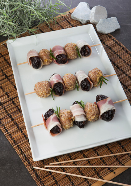 Impastare il macinato, la salsiccia, la salsa di noci, i Fiokki, il parmigiano reggiano e aggiustare di sapore con il sale alle erbe. Lasciare riposare 10 minuti. Formare delle polpettine della grandezza di una noce e rotolarle nelle noci tritate. Denocciolare le prugne e avvolgerle, una ad una, nelle fette di guanciale e creare gli spiedini alternando le polpette di carne alle prugne. Decorare con rametti di rosmarino.
