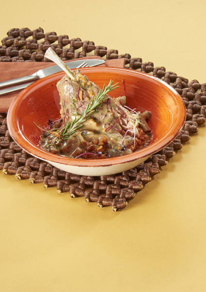 In un contenitore mettere lo Stinco con il Fondo ai funghi porcini, un po’ di Timo e scaldare in microonde per 3 minuti (usare la funzione grill per la rosolatura dello stinco). Aggiungere Fantasia di funghi e scaldare per altri 30 secondi. Scaldare le Lenticchie in umido per 1 minuto e aggiungere un po’ di Prezzemolo. Impiattare lo Stinco accompagnato dalle Lenticchie e dalla salsa di funghi. Decorare con un rametto di rosmarino fresco.