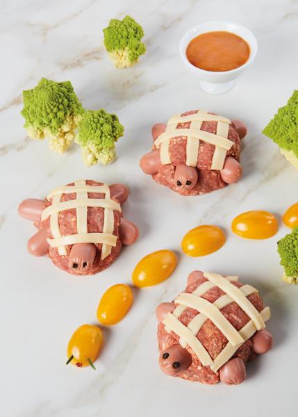 Impastare il macinato con i Fiokki e la Crema di zucca. Formare una grande polpetta schiacciandola leggermente. Comporre delle striscioline con la fettina di formaggio e posarle sul dorso del corpo delle tartarughe di carne. Tagliare a metà due mini würstel e formare le zampette. Utilizzare due terzi dell’altro würstel per la testa e come occhi inflare i chiodi di garofano. La parte rimanente utilizzarla per la coda.