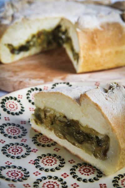 l’uvetta, i pinoli e le Olive nostraline. Chiudere la torta con altra pasta e