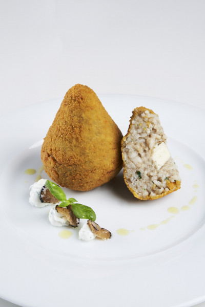 Clean the shallots, chop them, add a little extravirgin olive oil and microwave for one minute. In a pan, toast the Carnaroli rice over a low heat; as soon as the grains are well toasted, pour in the white wine and when it evaporates start adding the vegetable stock a little at a time. Add the shallots and continue cooking. Two minutes before the risotto is cooked, add the cream of button mushrooms aromatised with truffle, leave to flavour for a couple of minutes, turn off and stir in the cold butter, Parmigiano Reggiano cheese and finely chopped parsley. Transfer to a large baking tray so that the rice can cool evenly. To form the arancini, take a handful of risotto, create a hole in the middle and place a piece of Caciotta cheese inside. Close with some rice and roll the arancini into a conical shape, ensuring they are nice and firm. Place the flour in a bowl and pour in a few tablespoons of water to create a batter that is dense and sticky but not too fluid. Dip the arancini into the batter, making sure they are fully covered. Roll the arancini in breadcrumbs and press well so that they stick to the batter. Fry the arancini in peanut oil at 175°C for a few minutes, when golden brown drain them on kitchen paper.