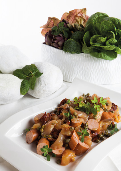 Put the prepared chicken strips in a bowl, add salt. Cut the Tutto sole tomatoes à la julienne and cut the giant frankfurters in four. Add the small capers in oil and the strips. Cook in a non-stick skillet for 8/9 minutes with a drizzle of extra virgin olive oil.