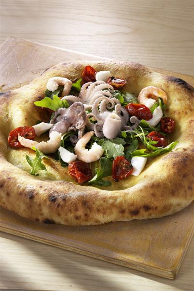 Roll out the dough, spread the mozzarella over it and bake in the oven. After cooking, add the Benserviti Atlantica Seafood Salad(seasoned with oil and salt), mixing it with rocket salad and the Menù “Dorati” cherry tomatoes with basil.