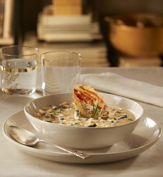 Tritare lo scalogno e rosolarlo in Olio extra vergine di oliva. Aggiungere l’aglio schiacciato ed il rametto di rosmarino. Aggiungere il Brodo vegetale granulare e la Zuppa di ceci. Successivamente aggiungere i Cardoncelli della Murgia leggermente sminuzzati. Insaporire gli ingredienti e cuocere per 5 minuti fino ad ottenere la consistenza desiderata. Aggiustare di sale e pepe. Servire la zuppetta ben calda con un filo di Olio extra vergine di oliva, Pepe colorato macinato e crumble di pancetta croccante.
