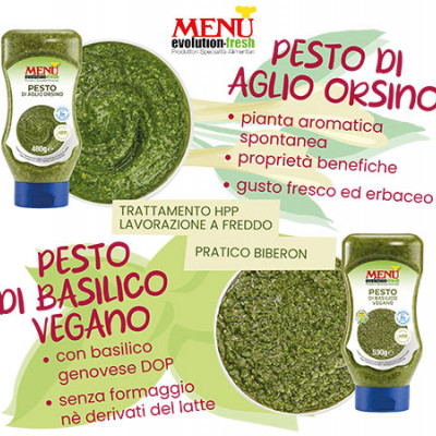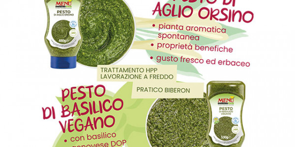 Pesto de ajo de oso y Pesto de albahaca vegano: dos nuevas recetas de Menù en el práctico dosificador antigoteo...