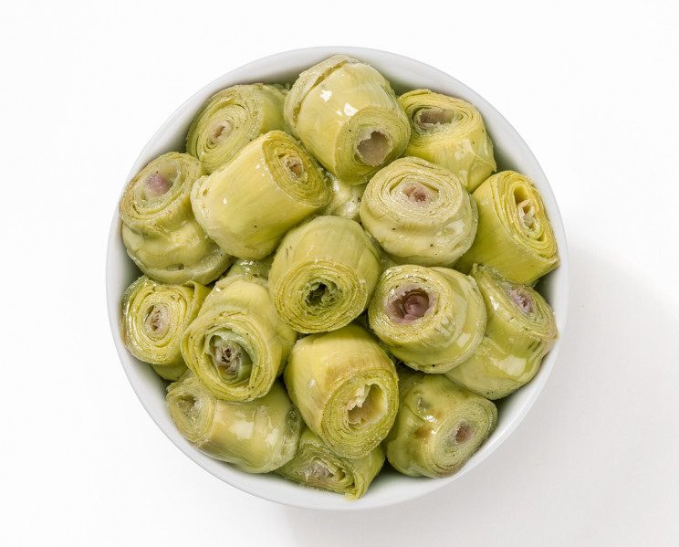 Alcachofas enteras sin tallo, preparadas con aceite y hierbas aromáticas. Adecuadas especialmente para bufés, entrantes o como ingrediente en pizzas gourmet.
