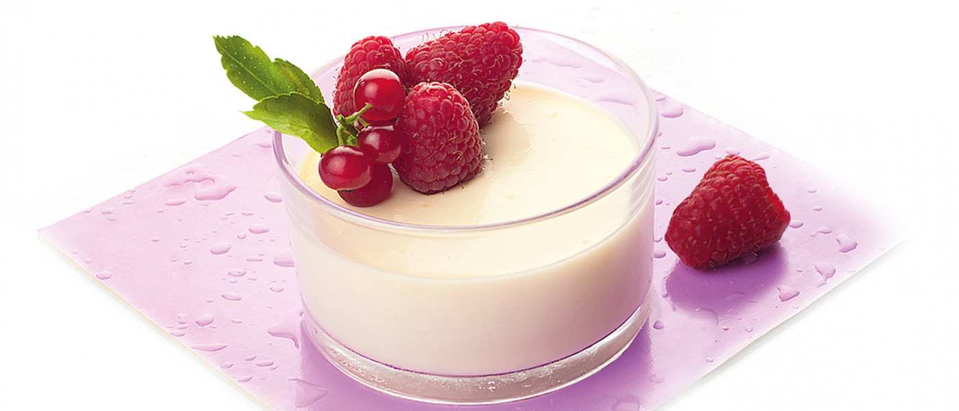 La nueva panacota realizada con la tecnología Evolution y preparada únicamente con leche, nata, azúcar y gelatina, es un postre listo para servir que se conserva a temperatura ambiente. El uso de leche y nata frescas otorga a este producto un buqué sensacional que abarca desde el aroma de la mantequilla fresca hasta una nota dulce de vainilla.