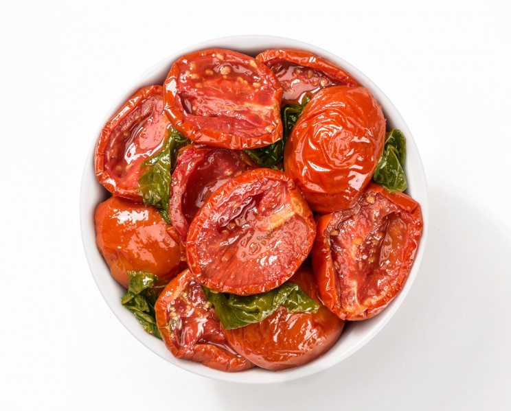 Recolectado en el campo y cortado por la mitad, el tomate se seca de forma lenta y constante para conservar su sabor y frescura. Preparado en aceite y aderezado con hierbas aromáticas y hojas de albahaca fresca, es ideal para bufés y entrantes fríos, como la ensalada caprese, y para acompañar platos a base de pescado y ensaladas de pasta.