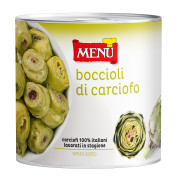 Alcachofas cortadas en gajos, salteadas en aceite con hierbas aromáticas. La receta sin vinagre permite utilizar el producto en caliente, por lo que es ideal como ingrediente en pizzas, focaccia y como guarnición.