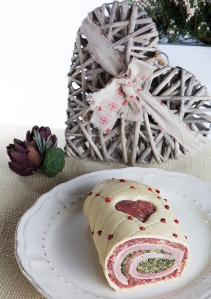 Mezclar la carne con 25 g. de Fiokky y la sal de hierbas y dejar reposar durante 10 minutos. Extiéndalo en la masa de hojaldre de 1/2 cm de grosor. Preparar el relleno de espinacas mezclando con 50 g. de Fiokky, el Grancrema al Parmesan y sazone con sal y pimienta. Poner sobre la carne el queso en lonchas, seguido del jamón cocido y finalmente el relleno de espinacas. Enrolle todo, teniendo cuidado de cerrar bien los lados. Cubrir con el hojaldre haciendo que se adhiera biien los bordes . Realiza ligeras incisiones en rombos y decora con pimienta rosa. Corta dos corazones grandes en la parte superior del rollo y luego retira el hojaldre para que puedas ver la carne. Hornee en el horno durante unos 35 minutos a 170 ° C.