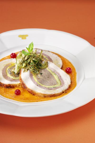 Tagliare a libro la fesa di tacchino e sistemarla tra due fogli di forno, spianarla con l’aiuto del batticarne per ottenere una fetta di carne dello spessore di 1/2 cm. In una ciotola sbattere tre uova insieme alla menta tritata; aggiustare di sale e pepe e con il composto ottenuto, confezionare una frittata. Lavorare il macinato di maiale con la Gransalsa di cuori di carciofo, i Fiokki, un uovo e il Parmigiano grattugiato; salare e pepare amalgamando con cura. Rivestire un foglio di carta forno con le fette di pancetta arrotolata disposte a lisca di pesce e ricoprire con la fesa battuta aromatizzando con il Profumoro. Farcire il tacchino accomodandovi sopra le fette di prosciutto cotto, la frittata e la farcia di macinato aromatizzato ai Carciofi che andrà stesa su tutta la superficie della carne. Sollevando il foglio di carta forno arrotolare l’arrosto che dovrà risultare completamente foderato con le fette di pancetta; legarlo con lo spago e insaporirlo con altro Profumoro. Trasferire il rotolo in una pirofila aggiungendo un poco d’Olio extravergine di oliva, il Soffritto pronto, aglio e rosmarino. Rosolare l'arrosto a fiamma viva per tutta la superficie e bagnare con vino bianco; lasciar evaporare. Cuocere in forno preriscaldato a 180°C per circa 1 ora e 20 minuti, bagnando durante la cottura con il brodo precedentemente preparato. Nel frattempo trifolare i carciofi freschi tagliati a fettine con uno spicchio d'aglio e Olio extravergine di oliva, salando e pepando. Servire l'arrosto tagliato a fette accompagnato alla salsa ottenuta dal fondo di cottura frullato disposta a specchio sul piatto. Guarnire con i carciofi trifolati, foglioline di menta e bacche di ribes rosso.