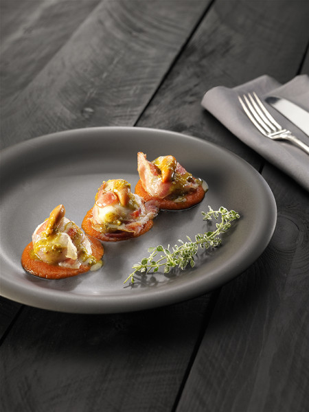 Con l’aiuto di un mixer ad immersione frullare Pomodorina e passarla al colino fine. Lavare e asciugare con cura le capesante, quindi separare il corallo dalla noce che andrà avvolta nelle fettine di pancetta stagionata. Trasferire poi le noci di capesante in una pirofila ed infornarle a 200°C per qualche minuto. Nel frattempo in una padella scaldare un poco d’Olio extravergine di oliva e farvi saltare i coralli; sfumare con il brandy e aggiustare di sale e pepe. A questo punto scaldare leggermente la Pomodorina, distribuirla al centro dei piatti e accomodarvi sopra le capesante bollenti. Completare con i coralli saltati in padella e il Pesto ai pistacchi.