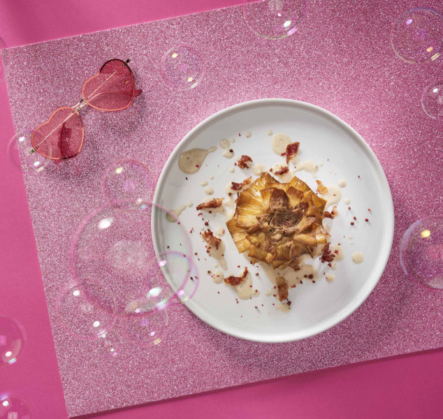 In un tegame scaldare l’olio di girasole portandolo a 180°C. Immergere il Carciofo alla Giudìa aperto a fiore e friggerlo. Scolarlo e asciugarlo con un panno carta. Posizionare il Carciofo al centro di un piatto. Aggiungere la salsa Ècacioepepe scaldata precedentemente e listarelle di Guanciale rosolato. Ultimare la preparazione con Pepe rosa e servire.