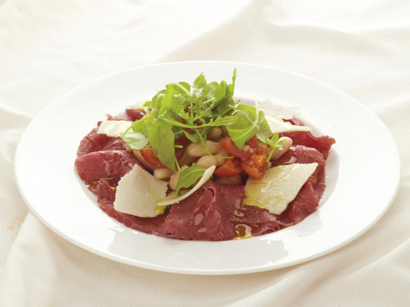 Preparare una citronette con il limone spremuto, l'Olio extravergine di oliva, sale e pepe. Tagliare la Carne salada e disporla su un piatto tondo lasciando un vuoto al centro. Condire i Fagioli cannellini ed i pomodori Dorati e la citronette. Aiutandosi con uno stampo adagiare al centro del piatto i Fagioli e i pomodori Dorati, guarnire con un ciuffetto di rucola, aggiungere il Parmigiano a scaglie e salsare con il Pesto di Senape diluito con un goccio di Olio.
