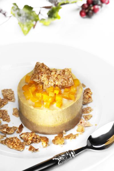 Amalgamare la Base Biscotto per Cheesecake con 125 g di burro e con il composto ottenuto rivestire la base di sei stampini monoporzione e riporli in frigorifero. Nel frattempo con la planetaria o il montapanna montare per 5 minuti il preparato in polvere Dolce freddo insieme al latte freddo; aggiungere la Crema di zucca, gli amaretti sbriciolati e mescolare con cura. Riempire gli stampini monoporzione con il Semifreddo alla Zucca, quindi trasferirli nel congelatore per almeno 2 ore. Seguendo le istruzioni riportate sulla confezione, preparare ora il Croccante distribuendo il prodotto Menù su una placca foderata di carta forno e cuocendo a 180° per 8 minuti in forno preriscaldato. A questo punto in una padella, candire sul fuoco la zucca fresca a dadini insieme allo zucchero e al burro rimasto. Sformare i Semifreddi nei piatti e completare con il Croccante sbriciolato e i cubetti di zucca candita.