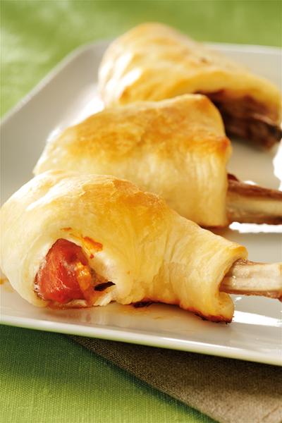 Cocinar las chuletas, sobre la plancha caliente, por ambos lados y retirar del fuego. Aplicar una capa de “Crema tartufata” sobre la carne y enrollar cada chuleta con una loncha de speck y otra de hojaldre.