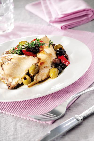 Preparare il Brodo utilizzando il prodotto Menù secondo le dosi e le modalità riportate sulla confezione. Tagliare in pezzi il coniglio, lavarlo ed asciugarlo. In una casseruola scaldare un poco d'Olio extravergine di oliva e farvi rosolare l'aglio. Aggiungere il coniglio, il timo, il rosmarino e lasciar cuocere finchè la carne avrà eliminato la propria acqua. Non appena i pezzi di coniglio prenderanno colore, bagnare con il vino bianco e far evaporare. A questo punto incorporare le Olive piccantine, aggiustare di sale e pepe e diluire con un poco di Brodo. Cuocere a fuoco moderato per circa 90 minuti, avendo cura di rigirare di tanto in tanto i pezzi di carne. Appena cotto servire con le Olive e il timo fresco.