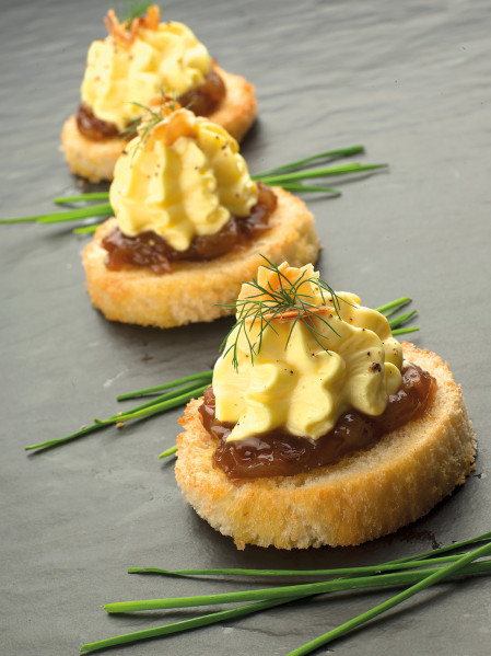 Prendere il Pane Bruschetta...Mia, imburrarlo e con un coppa pasta, tagliare dei crostini circolari. Tostarli in forno per alcuni minuti. Preparare la Crema al Parmigiano aggiungendo al formaggio morbido la Grancrema di Parmigiano Reggiano. Quando i crostini si saranno raffreddati, aggiungere la Cipolla caramellata e la Crema di Parmigiano con l'aiuto di una sac-à-poche. Ultimare con delle mandorle tostate e un ciuffo di aneto.
