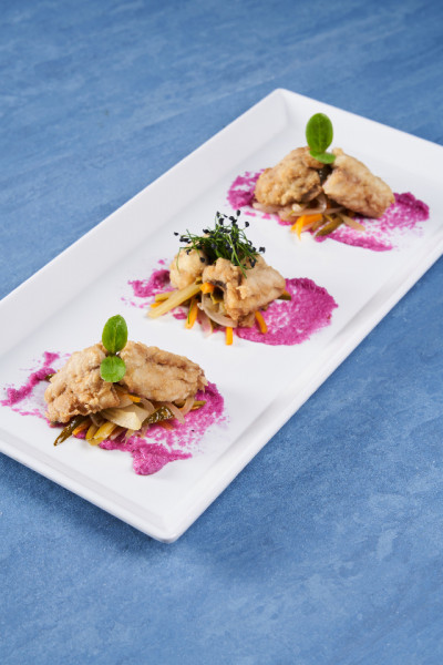 Cortamos todas las verduras en juliana y para los calabacines utilizamos solo la parte verde. Salteamos las verduras unos minutos con una hoja de laurel; en una cacerola a parte ponemos el vino, el vinagre y el azúcar y llevamos a ebullición. Dejamos hervir un par de minutos y luego añadimos las verduras ya salteadas, llevando nuevamente a ebullición. Dejamos enfriar. Por otro lado, cortamos el filete de caballa en tres partes iguales, lo enharinamos y sofreímos en aceite de cacahuete muy caliente hasta que esté dorado. Ponemos la mezcla de vinagre, vino y verduras en un bol pequeño y disponemos encima los filetes de caballa fritos. Dejamos reposar una noche en el frigorífico. Servimos colocando una capa de verduras y el filete de caballa sobre una cama de salsa de lombarda, decorando al gusto.