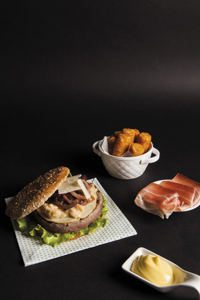 Completare la presentazione dell’hamburger aggiungendo insalata, scamorza affumicata, cipolla rossa alla griglia, grancrema al parmigiano reggiano, gransalsa di porcini e qualche scaglia di parmigiano reggiano. Accompagnare con maionese della casa, crocchette preparate con krokkie menù e fettine di speck.
