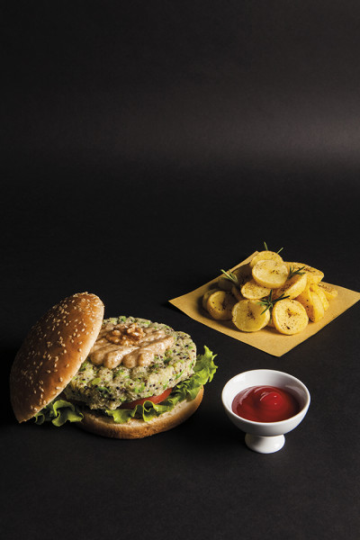 In una padella antiaderente tostare la quinoa per qualche minuto dopo averla ben lavata e cuocerla in acqua bollente salata per 20 minuti. Scolare e asciugare molto bene, trasferirla in una ciotola aggiungendo i piselli e i fagioli, precedentemente passati per un minuto al frullatore, l'erba cipollina e il prezzemolo. Aggiustare di sale e pepe. Con le mani formare gli hamburger aggiungendo i fiokki di patate e poi cuocerli in padella antiaderente o in forno a 170°C per 8-10 minuti. Completare la presentazione dell’hamburger aggiungendo la salsa di noci, la grancrema di parmigiano reggiano, una foglia di insalata verde e fettine di pomodoro fresco. Accompagnare con patate tagliate a rondelle e salsa ketchup.