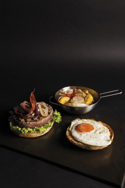 Completare la presentazione dell’hamburger con uovo al tegamino, insalata, pancetta, cipolle alla griglia, maionese della casa e salsa di fuoco. Accompagnare con patate saltate con dorati e cipolle alla griglia.