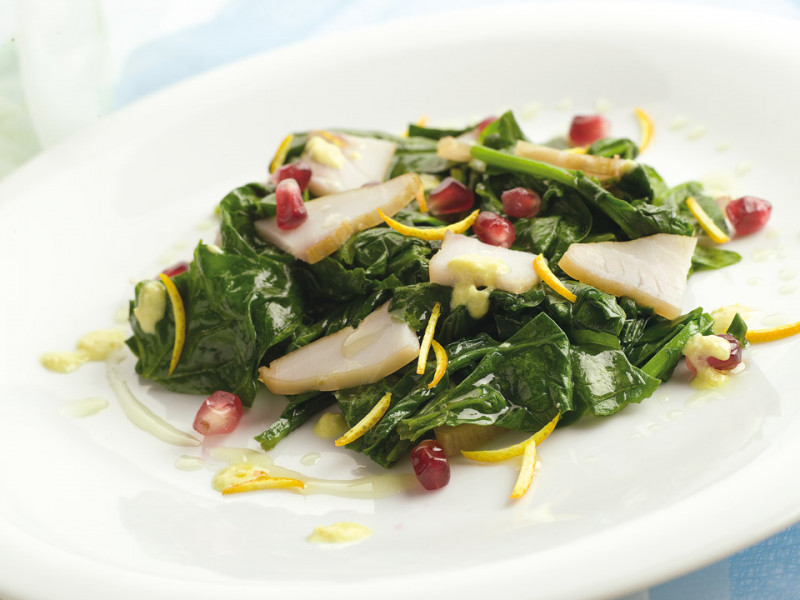 padella saltare con un filo d’olio per pochi minuti gli spinaci. Salare e pepare. Posizionarli al centro del piatto ed